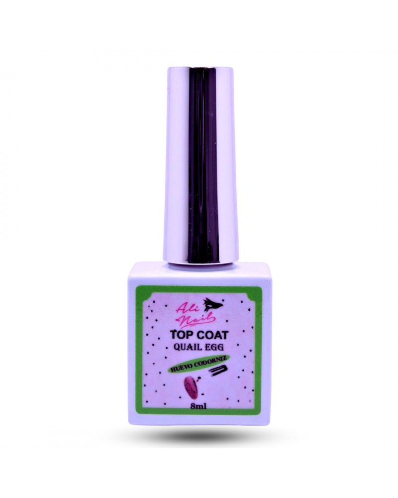 Ali Nails nos presenta el Top Coat Huevo Codorniz de alto brillo, dejando un finalizador espectacular de puntos negros, toques únicos provocando diseños preciosos para nuestras clientas. Top de larga duración, buena flexibilidad, sin agrietamiento ni amarilleo. -Utilizado para sellar esmaltes permanentes protegiendo y dejando capa superficial brillante. -Larga duración -10-Free -Veganos -No testeados en Animales -18 meses de duración una vez abierto -Compatibles con todas las marcas profesionales -Se recomienda aplicar en 1 capa uniforme después de aplicar y curar el color, curando por 60 segundos con lámpara LED o 2 minutos con lámpara UV. Es útil ya que "brilla levemente azulado" bajo la luz LED/UV para identificar si se ha aplicado o no el Top Coat. Bote 8 ml. Advertencia: Solo para uso profesional, mantener lejos de los niños, no exponer a altas ni bajas temperaturas ni a la luz solar y en caso de alergia o irritación dejar de utilizar y consultar con un médico.