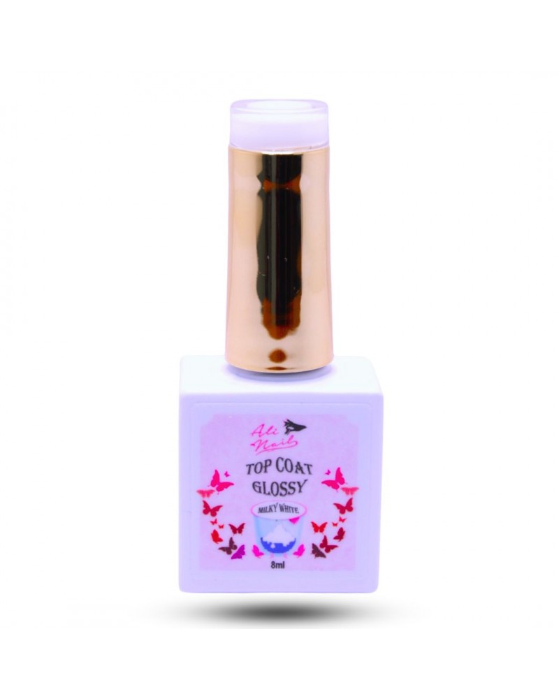 Top Coat Glossy "MILKY WHITE" es un top de alto brillo, para dar un efecto de manicura francesa, un aspecto natural y sofisticado con el Milky WHITE. No deja capa pegajosa después del secado y es flexible. Tiene una durabilidad garantizada y prevención de fracturas en la parte superior de una manicura francesa. Advertencia: Solo para uso profesional, mantener lejos del alcance de los niños, en caso de alergia o irritación dejar de utilizar el producto y si fuese necesario consultar con un medico, no exponer a temperaturas +20º -3º ni directamente a la luz solar. Bote 8ml. Aplicación: Aplicar una fina capa y secar en lampara 60 seg. Dejar enfriar 30 seg.