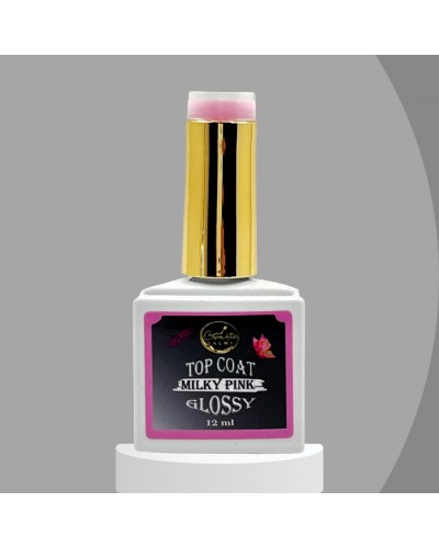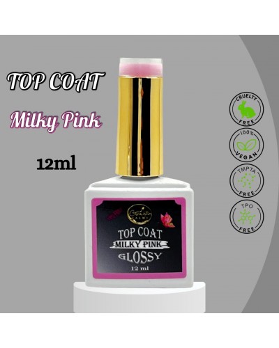 Top Coat Glossy Milky Pink 12ml. Hema Free, Cruelty Free, TPO Free, TMPTA Free. Brillo de uñas Rosa Lechoso