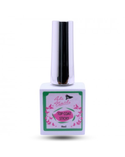 Aplicación: Aplicar una capa muy fina y secar lámpara LED 60 seg, UV 120 seg en algunos casos a veces es necesario aumentar el tiempo de secado dependiendo de la lampara y limpiar la capa de dispersión. Ali Nails acaba de sacar al mercado el Top Coat Sticky con capa pegajosa ideal para decoración y alto brillo donde no pierde su brillo a la hora de ser limpiado. es suave, con una consistencia agradable y de fácil aplicación. Alto Brillo. Bote 8ml Advertencia: Solo para uso profesional, mantener fuera del alcance de los niños, en caso de producir algún tipo de alergia dejar de utilizar el producto y si fuese necesario consultar con su medico, no exponer a temperaturas +20º, -3º y directamente a la luz solar.